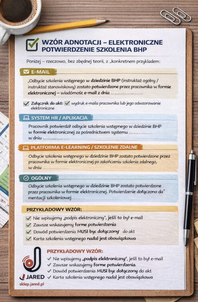 „Potwierdzam, że w dniu 12.12.2025 r. odbyłem instruktaż ogólny w ramach szkolenia wstępnego w dziedzinie BHP. Jan Kowalski”